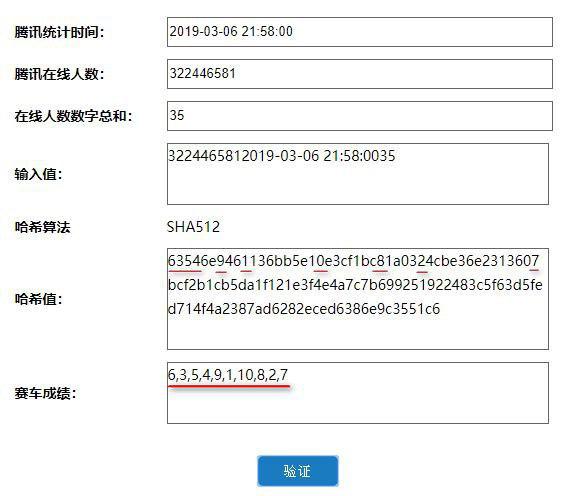 系统会利用腾讯在线人数+统计时间+在线人数数字总和=> 3224465812019-03-06 21:58:0035执行SHA512哈希算法取得演算结果。